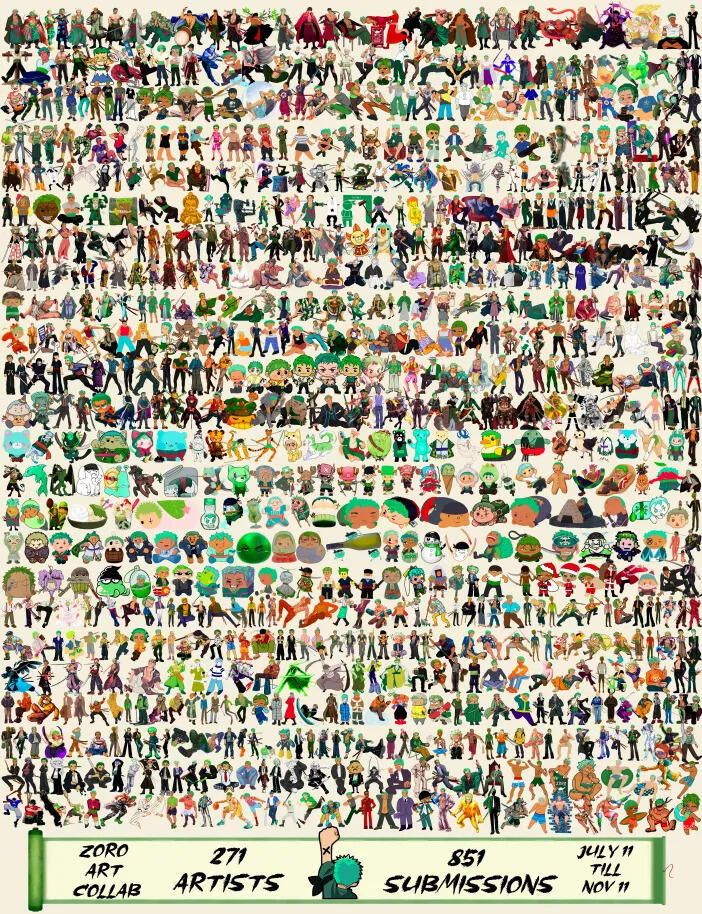 July 11 - November 11, 2025Come together in this SFW art Collab to draw as many outfits Zoro has appeared in as possible, from manga/anime canon, to merch, to crossovers, and more!! All skills are welcome, as well as both digital and traditional art.From the creator of the Sanji Art Collab.